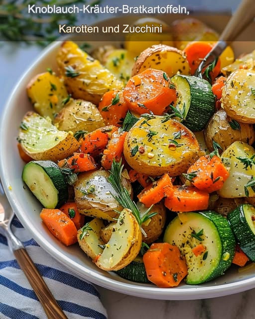 Mit Knoblauch und Kräutern gebratene Kartoffeln, Karotten und Zucchini