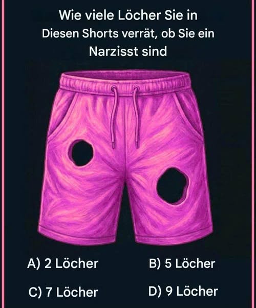 Auf den ersten Blick wirkt dieses virale Bild wie nichts weiter als eine zerrissene Shorts. Doch sobald man die Überschrift liest – „Wie viele Löcher du in dieser Shorts siehst, verrät, ob du ein Narzisst bist“ – schaltet das Gehirn augenblicklich vom passiven Scrollen in den analytischen Modus. Und genau deshalb hat dieses optische Rätsel die sozialen Medien im Sturm erobert: Es fordert unsere Wahrnehmung heraus und neckt gleichzeitig unser Ego.